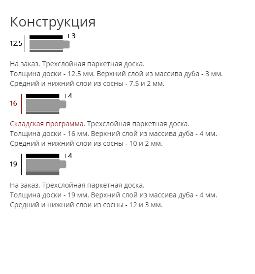 "CHARACTER. Складская программа. Допускаются живые не выпавшие сучья до 50 мм, выпавшие сучья до 20 мм и небольшие трещины до 40 мм, тщательно заделанные шпатлевкой. Допускаются перепады тонов, сердцевинные лучи, прожилки. Заболонь не допускается. SUPER-SELECT. На заказ. Обладает натуральным рисунком древесины, возможны незначительные перепады по тону и цвету. Предполагает однородную текстуру без резких перепадов и различий по цвету. Допускаются здоровые не выпавшие сучья до 5 мм. Заболонь и трещины не допускаются. На заказ возможно изготовление паркетной доски монодлины (все доски в пачке максимального размера). Паркетная доска TREND LINE возможна как в стандартном исполнении так и на заказ. Доска имеет три размера по толщине: 12,5 мм, 16 мм, 19 мм и три размера по ширине: 110 мм, 190 мм и 300 мм.