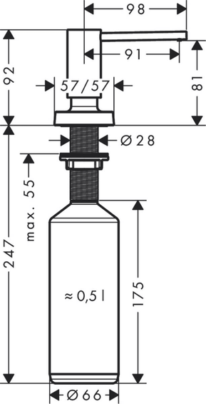 Дозатор мыла / лосьона подходит для подобранного дизайна к выбранным смесителям для кухни, выступ 91 мм, материал: прочная металлическая конструкция, нержавеющая выпускная труба, объем наполнения 500 мл, дозировка 2 мл, легко заправлять сверху, для установки в столешницу до 55 мм, простая и безопасная установка без инструментов, необходимо монтажное отверстие диаметром 28-35 мм. Есть варианты в других цветах: - черный матовый - арт. 40448670 - цвет нержавеющая сталь - арт. 40448800