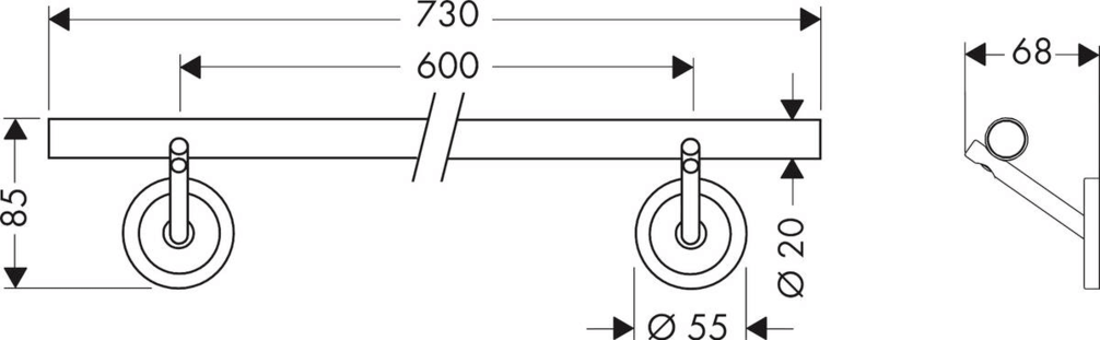 Полотенцедержатель и рейлинг, материал: металл, длина 730 мм, настенный монтаж, розетка: круглая, расстояние между отверстиями 600 мм, настенный монтаж, материал держателя: металл.