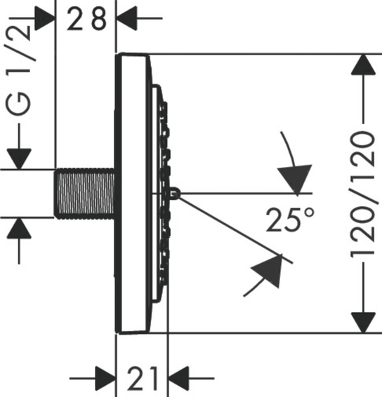 Боковая форсунка 100, 1jet размер душевого диска: 100 мм, тип струи: RainAir, регулировка направления струи поворотом диска, поворот на 360°, розетка: квадратная, расход воды для струи RainAir (при 3 бар): 4,5 л/мин, соединительная резьба: G ½. Есть вариант в белом цвете - арт. 28430400