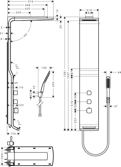 Душевая панель Lift 180 2jet состоит из душевой панели, верхнего душа, ручного душа-«палочки», шланга для душа, держателя для душа, верхний душ Raindance S 180 Air, размер душевого диска: 180 мм, длина держателя для душа: 420 мм, регулировка высоты: 200 мм, тип струи (верхний душ): RainAir, ливневая струя, расход воды для струи RainAir (при 3 бар): 14 л/мин, расход воды для ливневой струи (при 3 бар): 17 л/мин, защита от ожогов при 40°, регулируемый ограничитель температуры горячей воды, изолированная подача воды, межосевое подключение: 150 мм ± 12 мм, соединительная резьба G ½, место установки: стена, вид монтажа: внешний монтаж, подходит для проточных водонагревателей. Есть вариант в бело-хромовом цвете - арт. 27008400