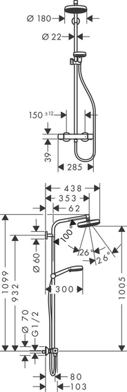 Душевой набор 160 с термостатом состоит из верхнего душа, ручного душа, термостата для душа, штанги для душа, держателя для душа, душевой штанги, верхний душ Crometta 160, размер диска верхнего душа: 160 мм, типы струй верхнего душа: Rain, шарнирное соединение: регулируемый угол верхнего душа, угол наклона может изменяться до 45°, тип струи ручной душ: Rain, массажная, Shampoo, обычная, держатель для ручного душа регулируемый по высоте, диаметр штанги: 22 мм, подъемная труба может быть укорочена по высоте, длина держателя верхнего душа: 350 мм, максимальный расход воды при давлении 3 бара: 17 л/мин, расход воды для струи Rain (при 3 бар): 17 л/мин, рабочее давление: мин. 1 бар/макс. 10 бар, термостат Ecostat Universal, предохранительный ограничитель при 40°C, регулируемый ограничитель температуры горячей воды, пользовательское управление посредством вращения рукоятки, вид монтажа: внешний монтаж, соединительная резьба G ½, межосевое подключение 150 мм ± 12 мм.