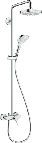 Душевой набор 180 состоит из верхнего душа, ручного душа, однорычажного смесителя для душа, шланга для душа, держателя для душа, душевой штанги, тип струи ручной душ: массажная, IntenseRain, SoftRain, верхний душ Croma Select E 180 2jet, размер диска верхнего душа: 180 мм x 180 мм, шарнирное соединение: регулируемый угол верхнего душа, типы струй верхнего душа: Rain, IntenseRain, регулируемое по высоте крепление ручного душа, длина держателя верхнего душа: 400 мм, поворотный держатель для душа, расход воды для струи IntenseRain (при 3 бар): 16 л / мин, расход воды для струи Rain (при 3 бар): 16 л / мин, рабочее давление: мин. 1 бар/макс. 10 бар, вид монтажа: внешний монтаж, соединительная резьба G ½, межосевое подключение 150 мм ± 12 мм, керамический узел смешивания, регулируемое ограничение температуры, диаметр штанги: 22 мм, подъемная труба может быть укорочена по высоте.