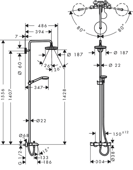 Душевой набор 180 с термостатом для ванны состоит из верхнего душа, ручного душа, термостата для ванны, штанги для душа, держателя для душа, душевой штанги, верхний душ Croma Select S 180 2jet, размер диска верхнего душа: 180 мм, типы струй верхнего душа: Rain, IntenseRain, удобное переключение типов струи с помощью кнопки Select, шарнирное соединение: регулируемый угол верхнего душа, тип струи ручной душ: массажная, IntenseRain, SoftRain, держатель для ручного душа регулируемый по высоте, диаметр штанги: 22 мм, подъемная труба может быть укорочена по высоте, поворотный держатель для душа, расход воды для струи IntenseRain (при 3 бар): 17 л/мин, расход воды для струи Rain (при 3 бар): 17 л/мин, рабочее давление: мин. 1 бар/макс. 10 бар, термостат Ecostat Comfort, расход воды для излива на ванну: 20 л/мин, предохранительный ограничитель при 40°C, регулируемый ограничитель температуры горячей воды, пользовательское управление посредством вращения рукоятки, вид монтажа: внешний монтаж, соединительная резьба G ½, межосевое подключение 150 мм ± 12 мм.