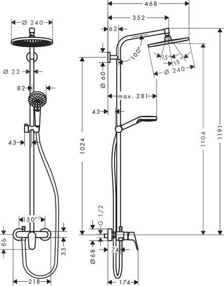Душевой набор 240 с однорычажным смесителем состоит из верхнего душа, ручного душа, однорычажного смесителя для душа, шланга для душа, держателя для душа, душевой штанги, тип струи ручной душ: Rain, IntenseRain, верхний душ Crometta S 240, размер диска верхнего душа: 240 мм, шарнирное соединение: регулируемый угол верхнего душа, типы струй верхнего душа: Rain, угол наклона может изменяться до 45°, регулируемое по высоте крепление ручного душа, длина держателя верхнего душа: 350 мм, регулируемый ограничитель температуры горячей воды, расход воды для струи Rain (при 3 бар): 15 л/мин, рабочее давление: мин. 0.18 MPa/макс. 1.0 MPa, полностью хромированный душевой диск, вид монтажа: внешний монтаж, соединительная резьба G ½, межосевое подключение 150 мм ± 12 мм, керамический узел смешивания, диаметр штанги: 22 мм, подъемная труба может быть укорочена по высоте.