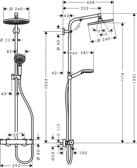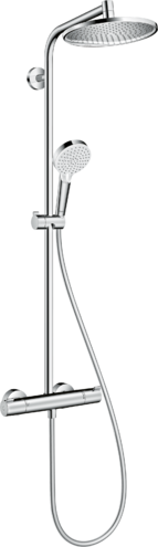 Душевой набор 240 с термостатом состоит из верхнего душа, ручного душа, термостата для душа, штанги для душа, держателя для душа, душевой штанги, верхний душ Crometta S 240, размер диска верхнего душа: 240 мм, типы струй верхнего душа: Rain шарнирное соединение: регулируемый угол верхнего душа, угол наклона может изменяться до 45°, тип струи ручной душ: Rain, IntenseRain, держатель для ручного душа регулируемый по высоте, диаметр штанги: 22 мм, подъемная труба может быть укорочена по высоте, длина держателя верхнего душа: 350 мм, максимальный расход воды при давлении 3 бара: 16 л/мин, расход воды для струи Rain (при 3 бар): 16 л / мин, рабочее давление: мин. 0.12 MPa/макс. 1.0 MPa, термостат Ecostat 1001 CL, предохранительный ограничитель при 40°C, регулируемый ограничитель температуры горячей воды, пользовательское управление посредством вращения рукоятки, вид монтажа: внешний монтаж, соединительная резьба G ½, межосевое подключение 150 мм ± 12 мм.