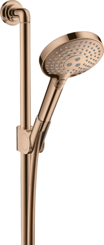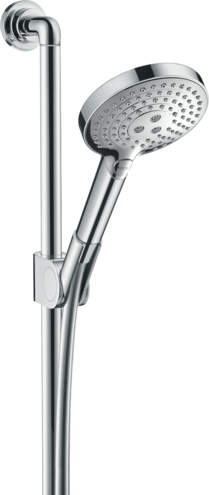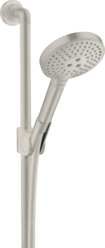 Душевой набор состоит из ручного душа, душевой штанги, шланга для душа, ползунка, размер душевого диска: 120 мм, тип струи: Rain, RainAir, WhirlAir, удобное переключение типов струи с помощью кнопки Select, со стороны душа упорный подшипник, предотвращающий перекручивание душевого шланга, настенная штанга 0,9 м, держатель для душевого шланга с конической гайкой, угол наклона смещается на 30°, максимальный расход воды при давлении 3 бара: 16 л/мин, хромированные настенные крепления из металла. Есть варианты в разных цветах с полированной и шлифованной обработкой.