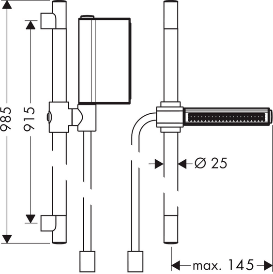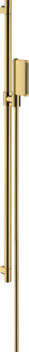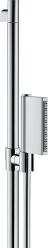 Душевой набор состоит из ручного душа-«палочки», душевой штанги, шланга для душа, ползунка, тип струи: обычная, каскад, удобное переключение типов струи с помощью кнопки Select, упорный подшипник на стороне душа и зафиксированной стороне душевой шланг с цилиндрической гайкой с обеих сторон, настенная штанга AXOR Starck 0,9 м, максимальный расход воды при 3 бар: 12 л/мин, хромированные настенные крепления из пластика. Есть варианты в разных цветах с полированной и шлифованной обработкой.