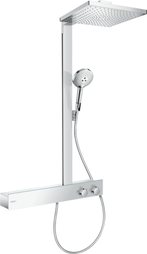 Душевой набор состоит из верхнего душа, ручного душа, термостата для душа, штанги для душа, держателя для душа, душевой штанги, верхний душ Raindance E 300 Air 1jet, размер диска верхнего душа: 300 x 300 мм, типы струй верхнего душа: RainAir, шарнирное соединение: регулируемый угол верхнего душа, держатель ручного душа регулируется в пределах 90°, поворачивается вправо и влево, перемещается вверх и вниз, тип струи ручной душ: Rain, RainAir, Whirl, поверхность полочки: анодированный алюминий, диаметр штанги: 61 mm, длина держателя верхнего душа: 405 мм, максимальный расход воды при давлении 3 бара: 16 л/мин, рабочее давление: мин. 1,5 бар/макс. 10 бар, термостат ShowerTablet 600, изолированная подача воды, предохранительный ограничитель при 40°C, пользовательское управление посредством вращения рукоятки, невозможно использование одновременно двумя потребителями, вид монтажа: внешний монтаж, соединительная резьба G ½, межосевое подключение 150 мм ± 12 мм.