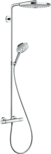 Душевой набор с термостатом состоит из верхнего душа, ручного душа, термостата для душа, штанги для душа, держателя для душа, душевой штанги, верхний душ Raindance Select S 300 2jet, размер диска верхнего душа: 300 мм, типы струй верхнего душа: RainAir, Rain, удобное переключение типов струи с помощью кнопки Select, поверхность душевого диска: хром или белый - арт. 27133400, тип струи ручной душ: RainAir, Rain, Whirl, держатель для ручного душа регулируемый по высоте, диаметр штанги: 25 мм, подъемная труба может быть укорочена по высоте, длина держателя верхнего душа: 460 мм, поворотный держатель для душа, максимальный расход воды при давлении 3 бара: 15 л/мин, рабочее давление: мин. 1 бар/макс. 10 бар, термостат Ecostat Comfort, предохранительный ограничитель при 40°C, регулируемый ограничитель температуры горячей воды, пользовательское управление посредством вращения рукоятки, подходит для проточных водонагревателей, вид монтажа: внешний монтаж, соединительная резьба G ½, межосевое подключение 150 мм ± 12 мм.