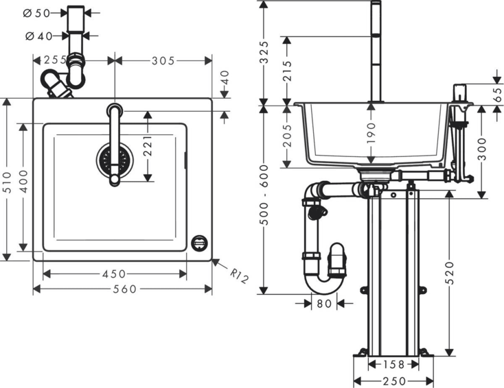 Кухонная комбинация 450 состоит из: - встраиваемая мойка, - кухонный смеситель, однорычажный, на 2 отверстия, - устройство управления, - корпус для шланга, - система слива с ручным управлением Материал мойки: SilicaTec, количество чаш: 1 основная чаша, расположение отверстия для смесителя определено (см. чертеж), глубина раковины: 190 мм, размер выреза: 540 x 490 мм, ширина кухонного шкафа: 60 см, способ установки: монтаж на столешницу, перелив: с правой стороны чаши, соединительные шланги G ⅜, подходит для проточных водонагревателей, керамический узел смешивания, магнитная система крепления душа MagFit, встроенный клапан обратного тока воды, угол поворота излива: 150°, ламинарная струя, душевая струя, ComfortZone 200, кнопка Select для комфортного включения/выключения воды, короб sBox для тихого, плавного, безопасного перемещения шланга в кухонном шкафу, под столешницей, длина удлинения до 76 см, максимальный расход воды при давлении 3 бара: 8 л/мин, высота смесителя: 325 мм.