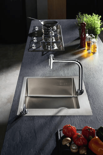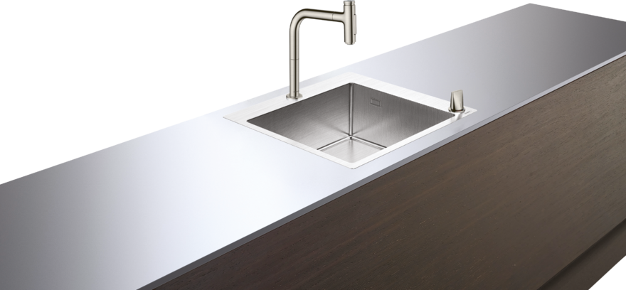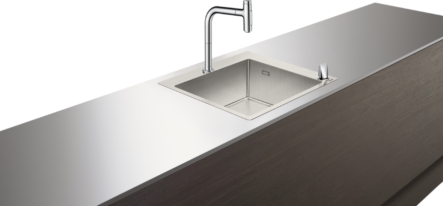 Новые комбинации HANSGROHE – это решение для современной кухни, объединяющее мойку и смеситель, интуитивное управление и высокие технологии. Кухонные комбинации Hansgrohe были созданы совместно со знаменитой дизайн-студией Phoenix Design (Штутгарт). В их состав входит мойка из качественной нержавеющей стали, смеситель и элемент управления, sBox, система слива, крепежные элементы и соединительный шланг. Это законченное решение, которое можно сразу устанавливать на столешницу. Геометричные формы, чуть скругленные углы придают мойкам стильный внешний вид и упрощают уход за ними. Широкая окантовка – узнаваемый элемент дизайна – предлагает дополнительную возможность: место для размещения смесителей на 2 отверстия, где рукоятка управления расположена на передней части мойки.