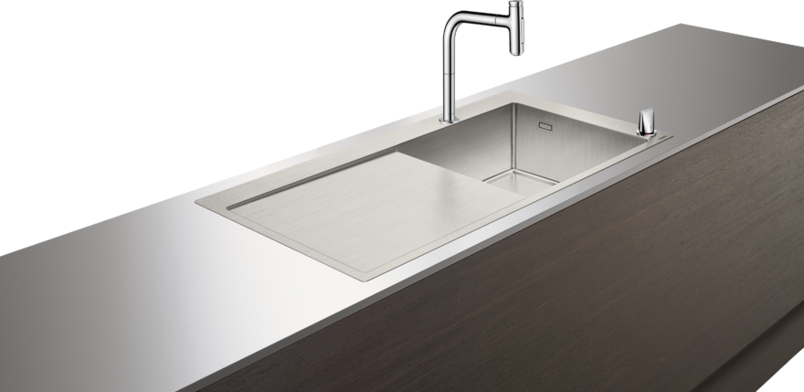 Новые комбинации HANSGROHE – это решение для современной кухни, объединяющее мойку и смеситель, интуитивное управление и высокие технологии. Кухонные комбинации Hansgrohe были созданы совместно со знаменитой дизайн-студией Phoenix Design (Штутгарт). В их состав входит мойка из качественной нержавеющей стали, смеситель и элемент управления, sBox, система слива, крепежные элементы и соединительный шланг. Это законченное решение, которое можно сразу устанавливать на столешницу. Геометричные формы, чуть скругленные углы придают мойкам стильный внешний вид и упрощают уход за ними. Широкая окантовка – узнаваемый элемент дизайна – предлагает дополнительную возможность: место для размещения смесителей на 2 отверстия, где рукоятка управления расположена на передней части мойки.
