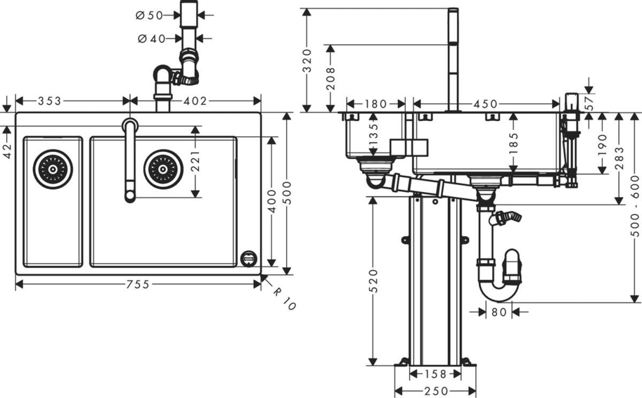 Кухонная комбинация 180/450 состоит из: - встраиваемая мойка, - кухонный смеситель, однорычажный, на 2 отверстия, - устройство управления, - корпус для шланга, - система слива с ручным управлением. Материал мойки: нержавеющая сталь, количество чаш: 1 основная чаша + 1 дополнительная чаша, отверстия для смесителя и элемента управления: просверлены, глубина раковины: 190 мм, размер выреза: 430 x 220 мм, ширина кухонного шкафа: 80 см, способ установки: монтаж на столешницу или вровень со столешницей, перелив: на правой стороне основной чаши для надежного, устойчивого положения смесителя, радиус угла: 10 мм, соединительные шланги G ⅜, подходит для проточных водонагревателей, керамический узел смешивания, магнитная система крепления душа MagFit, встроенный клапан обратного тока воды, угол поворота излива: 150°, ламинарная струя, душевая струя, ComfortZone 200, кнопка Select для комфортного включения/выключения воды, короб sBox для тихого, плавного, безопасного перемещения шланга в кухонном шкафу, под столешницей, длина удлинения до 76 см, максимальный расход воды при давлении 3 бара: 8 л/мин, высота смесителя: 320 мм. Есть вариант в цвете нержавеющая сталь - арт. 43206800