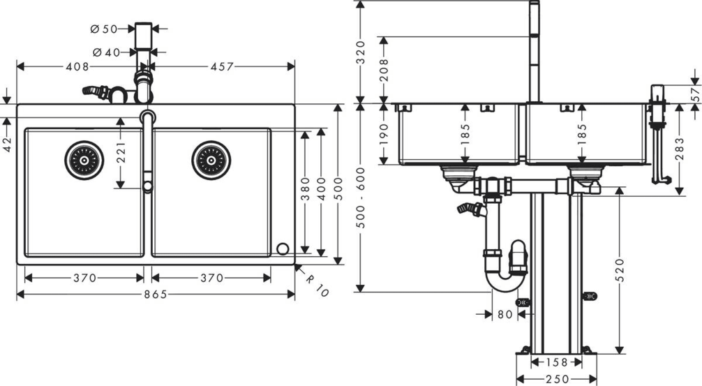 Кухонная комбинация 370/370 состоит из: - встраиваемая мойка, - кухонный смеситель, однорычажный, на 2 отверстия, - устройство управления, - корпус для шланга, - система слива с ручным управлением. Материал мойки: нержавеющая сталь, количество чаш: 2 основные чаши, отверстия для смесителя и элемента управления: просверлены, глубина раковины: 190 мм, размер выреза: 840 x 480 мм, ширина кухонного шкафа: 90 см, способ установки: монтаж на столешницу или вровень со столешницей, для надежного, устойчивого положения смесителя, радиус угла: 10 мм, соединительные шланги G ⅜, подходит для проточных водонагревателей, керамический узел смешивания, магнитная система крепления душа MagFit, встроенный клапан обратного тока воды, угол поворота излива: 150°, ламинарная струя, душевая струя, ComfortZone 200, кнопка Select для комфортного включения/выключения воды, короб sBox для тихого, плавного, безопасного перемещения шланга в кухонном шкафу, под столешницей, длина удлинения до 76 см, максимальный расход воды при давлении 3 бара: 8 л/мин, высота смесителя: 320 мм. Есть вариант в цвете нержавеющая сталь - арт. 43203800