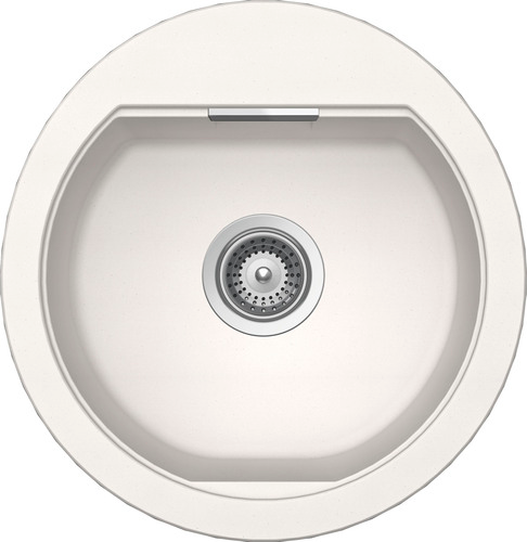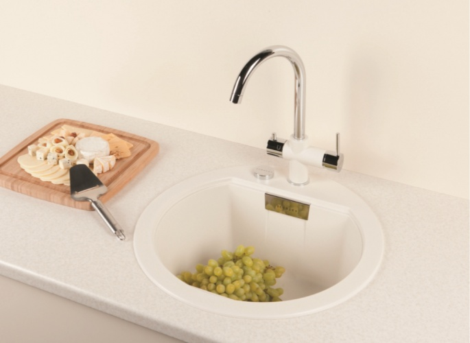 Элегантность и эргономика. Компактная мойка для современной минималистской кухни округлая в плане, с элегантной прямоугольной панелью перелива.