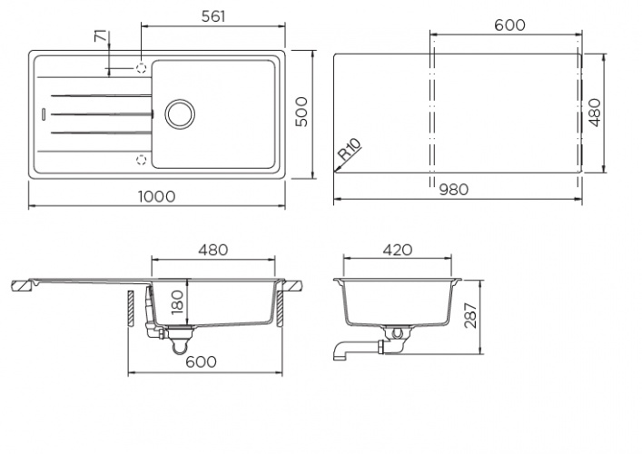 Минимальная ширина шкафа 60 см.Глубина чаши 190 мм.Учитывайте ширину пристенного канта при установкемойки возле стены или пенала.Все размеры приведены для установки мойки сверхустолешницы. Размеры выреза при установке мойки подстолешницу 986х486 R10. Может быть также выполнена в других цветах