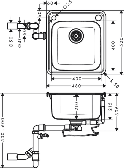 Встраиваемая мойка 400/400, размеры выреза: 470 x 510 мм, материал: нержавеющая сталь, количество чаш: 1 основная чаша, отверстие для летки и отверстие для всплывающего мусора предварительно просверлены, размер шкафа: 50 см, тип установки: плоский на столешнице (самозакрывающийся) или скрытый монтаж, положение перелива: сбоку от чаши, усиление планки смесителя для плотной и устойчивой посадки кухонного смесителя, угловой радиус: 70 мм, глубина мойки: 210 мм, автоматический набор для отходов в комплекте.