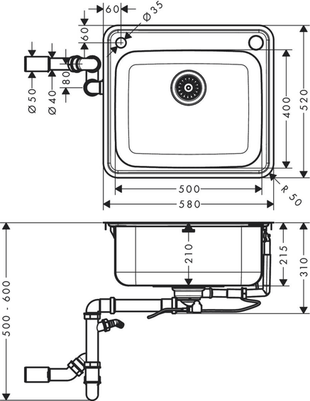 Встраиваемая мойка 500/400, размеры выреза: 570 x 510 мм, материал: нержавеющая сталь, количество чаш: 1 основная чаша, отверстие для летки и отверстие для всплывающего мусора предварительно просверлены, размер шкафа: 60 см, тип установки: плоский на столешнице (самозакрывающийся) или скрытый монтаж, положение перелива: сбоку от чаши, усиление планки смесителя для плотной и устойчивой посадки кухонного смесителя, угловой радиус: 70 мм, глубина мойки: 210 мм, автоматический набор для отходов в комплекте.