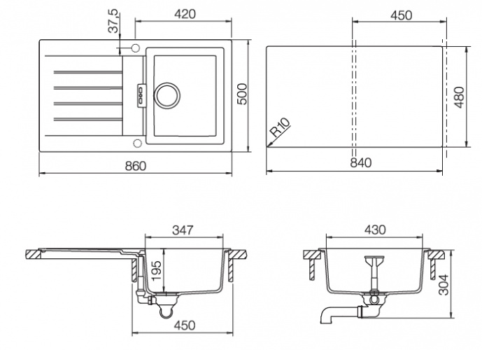 Размеры выреза при установке мойки подстолешницу 846х486 R10.* (Запросите шаблон выреза).*Не забудьте доукомплектовать специальным крепежомдля подстольного монтажа арт. 6.3016-8.Обратите внимание! Отводная арматура с клапаном-автоматом 3,5 дюйма и переливом, сифон с отводом для стиральной или посудомоечной машины, крепеж для врезного монтажа.