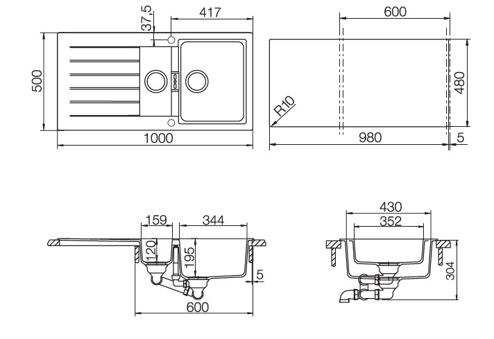 Отводная арматура с клапаном-автоматом 3,5 дюйма и переливом для основной чаши, 3,5 дюйма корзинчатый вентиль для дополнительной чаши, сифон с отводом для стиральной или посудомоечной машины, крепеж для врезного монтажа.