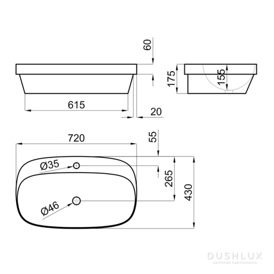 Встраиваемая раковина 70 см на столешницу без слива-перелива. Рекомендуется использовать открытый донный клапан сливной или решетку.