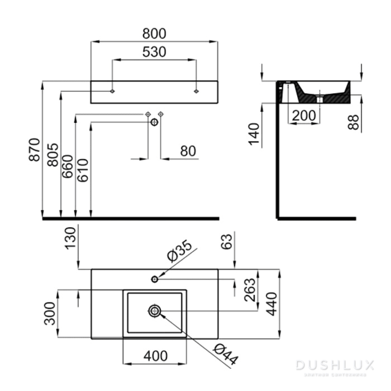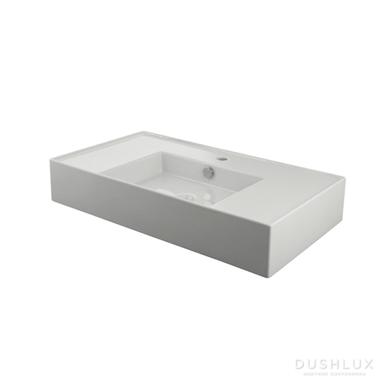 Раковина, 80 см, подвесная, углубление по центру, слив и крепления.