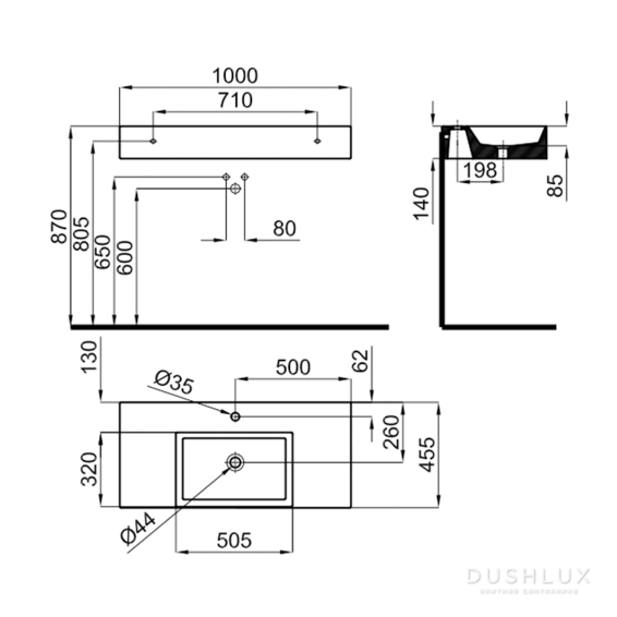 Раковина, 100 см, подвесная, углубление по центру, слив и крепления.