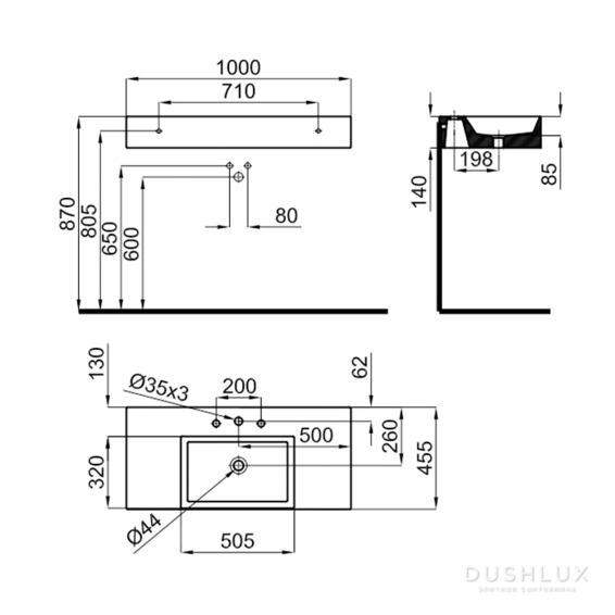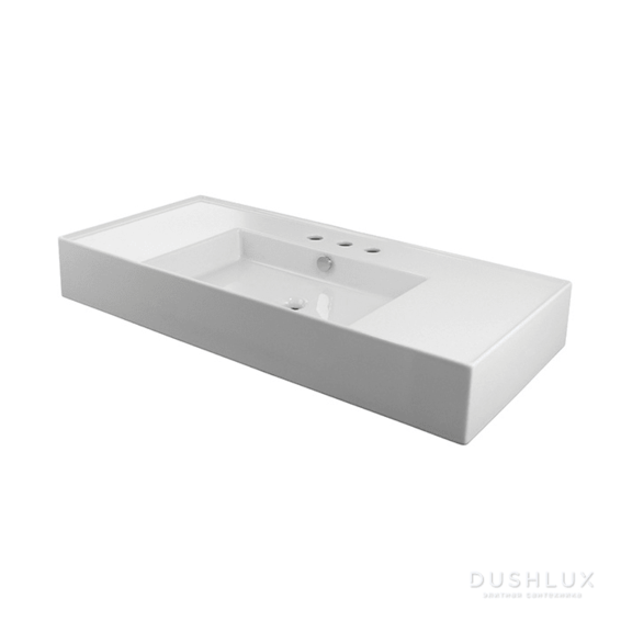 Раковина, 100 см, подвесная, углубление по центру, слив и крепления. С тремя отверстиями для смесителя.