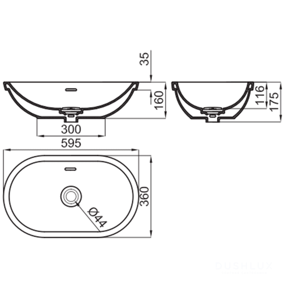 Раковина 59.5*36 см утопленная с переливом. Сливной клапан типа "clicker" с керамической крышкой входит в комплект.