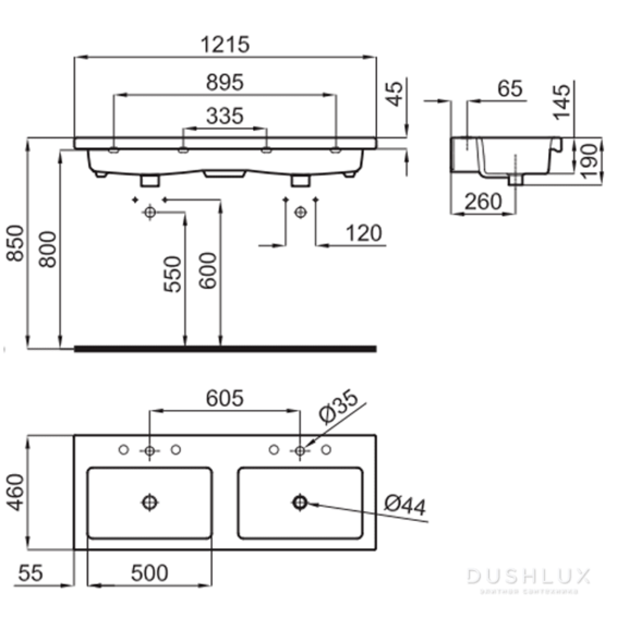 Раковина с двойным углублением 120 см, подвесная, со сливом и с креплениями.