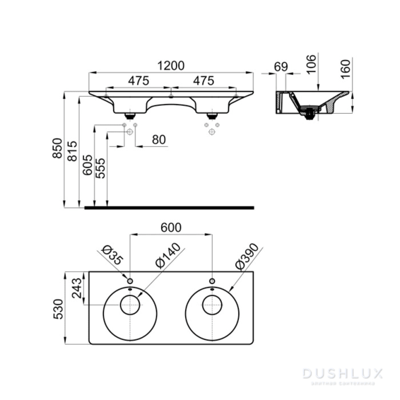 Подвесная раковина с двойным углублением 120 см с переливом и керамическим донным клапаном типа "clicker". В комплект входит крепеж.