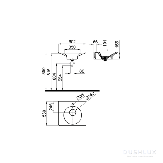 Подвесная раковина 60 см с переливом и керамическим донным клапаном типа "clicker". В комплект входит крепеж.
