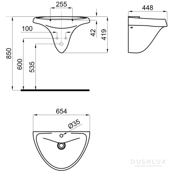 Раковина подвесная 650 мм с переливом. В комплект входит донный клапан типа "сlicker" с керамической крышкой, сифон и крепеж.