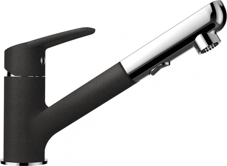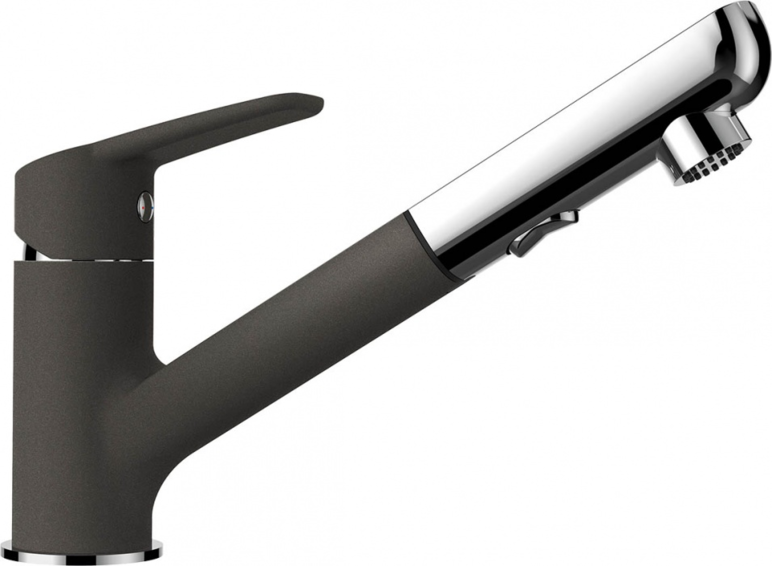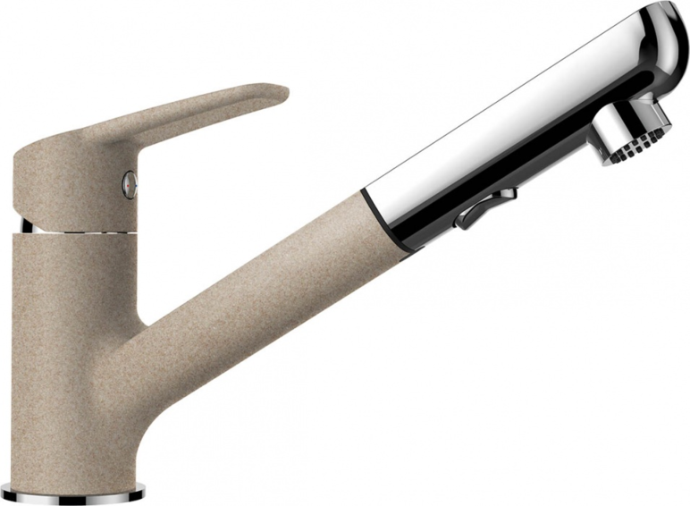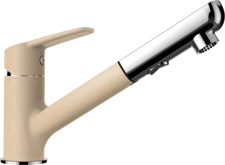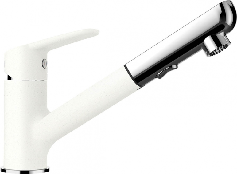 Выдвижной излив. Диапазон поворота излива 360°. Переключатель на режим струи или душа. Прекрасно сочетается с мойками из материала CRISTALITE®. Легкое подключение гибкими шлангами длиной 440 мм с гайкой 3/8”. Отверстие для монтажа 35 мм.