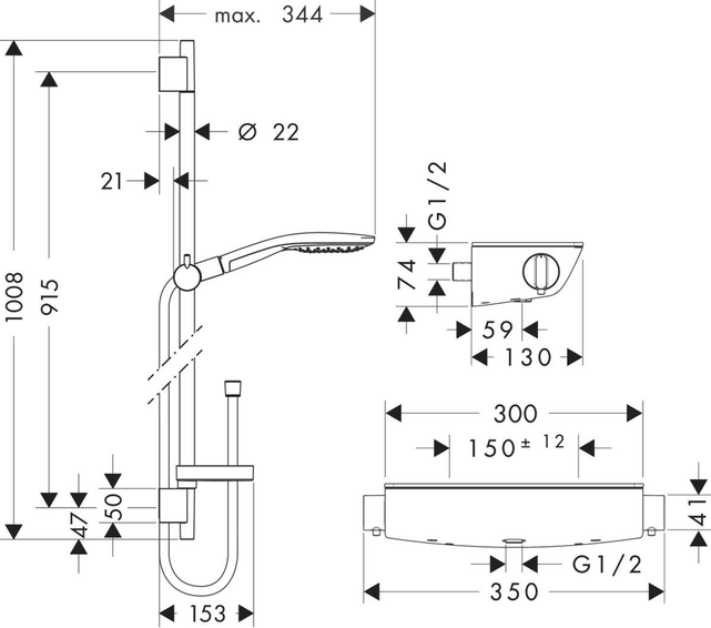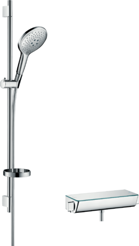 Душевая система внешнего монтажа 150 с термостатом Ecostat Select и штангой 90 см состоит из: - ручной душ, - термостат для душа, - душевая штанга, - держатель, - мыльница, - шланг для душа. Размер душевого диска: 150 мм, удобное переключение типов струи с помощью кнопки Select, тип струи ручной душ: RainAir, CaresseAir, Mix, со стороны душа упорный подшипник, предотвращающий перекручивание душевого шланга, максимальный расход воды при давлении 3 бара: 16 л/мин, профиль вертикальной трубки: круглая, диаметр штанги: 22 мм, держатель ручного душа регулируется в пределах 90°, поворачивается вправо и влево, перемещается вверх и вниз, для установки на соединительную резьбу G ¾ . Есть вариант в бело-хромовом цвете - арт. 27037400