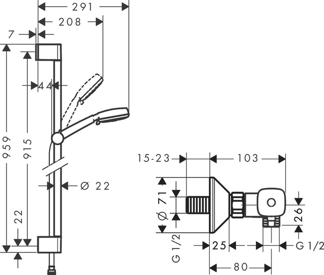 Душевая система внешнего монтажа Vario с термостатом Ecostat Universal и штангой 90 см состоит из: - ручной душ, - термостат для душа, - душевая штанга, - держатель, - шланг для душа. Тип струи Верхний душ: Rain, обычная, Shampoo, массажная, переключение типов струи с помощью вращающегося душевого диска, со стороны душа упорный подшипник, предотвращающий перекручивание душевого шланга, максимальный расход воды при давлении 3 бара: 16 л/мин, профиль вертикальной трубки: круглая, диаметр штанги: 22 мм, держатель ручного душа регулируется в пределах 90°, поворачивается вправо и влево, перемещается вверх и вниз.