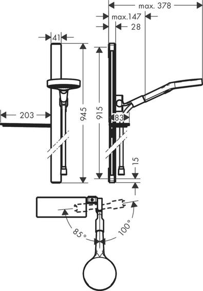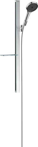 Душевой набор состоит из: - ручной душ, - душевая штанга, - полочка, - шланг для душа, - ползунок. Размер душевого диска: 130 мм, тип струи: PowderRain, Intense PowderRain, MonoRain, из безопасного стекла, удобное переключение типов струи с помощью кнопки Select, со стороны душа упорный подшипник, предотвращающий перекручивание душевого шланга, держатель ручного душа регулируется в пределах 90°, поворачивается вправо и влево, перемещается вверх и вниз, максимальный расход воды при давлении 3 бара: 14 л/мин, диаметр штанги 41 мм, профиль вертикальной трубки: квадратная со скругленными углами, настенные крепления из пластика, настенный монтаж: крепление с помощью шурупов, тип душевой штанги: плоский алюминиевый профиль с покрытием из безопасного стекла, покрытие: хром.