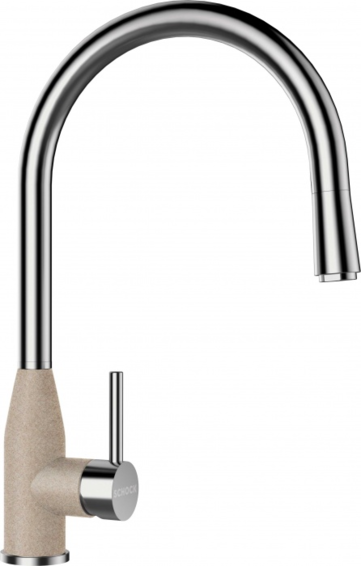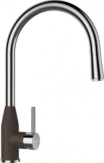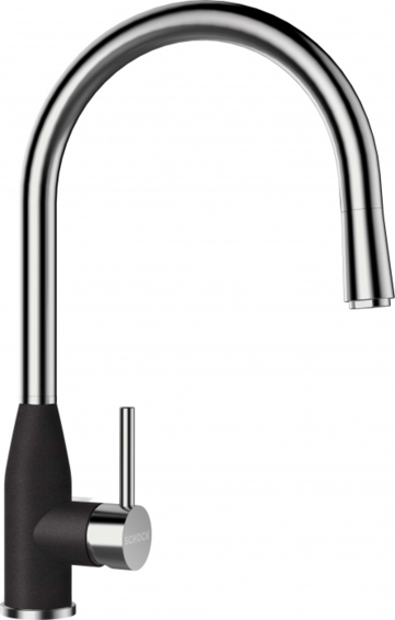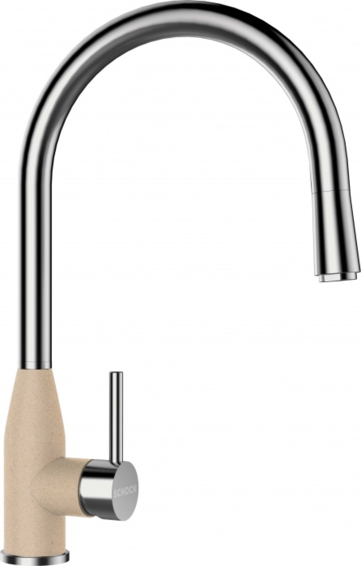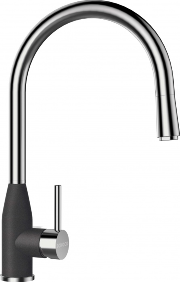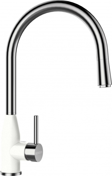 Высокий выдвижной излив. Излив поворачивается на 360°. Корпус окрашен в цвет моек из материала CRISTALITE®. Функционал-обратный клапан.
