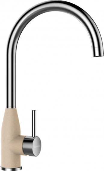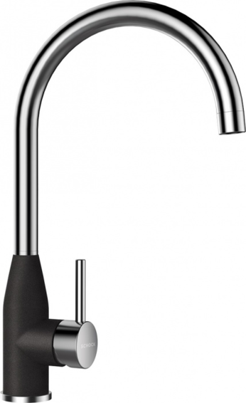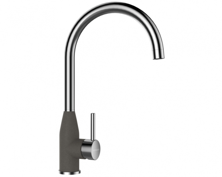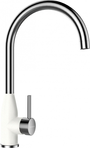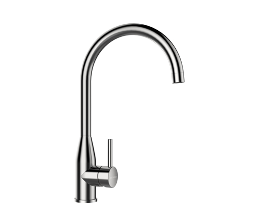 Высокий излив. Излив вращается на 360°. Корпус окрашен в цвет моек из материала CRISTALITE®. Легкое подключение гибкими шлангами длиной 400 мм с гайкой 3/8”. Отверстие для монтажа 35 мм.