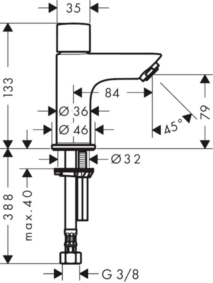 Кран 70, без сливного набора, ComfortZone 70, выступ 84 мм, тип струи: обычная струя, максимальный расход воды при давлении 3 бара: 5 л/мин, с керамическим вентилем 90°, только для холодной воды, вид соединения: соединительные шланги G ⅜.