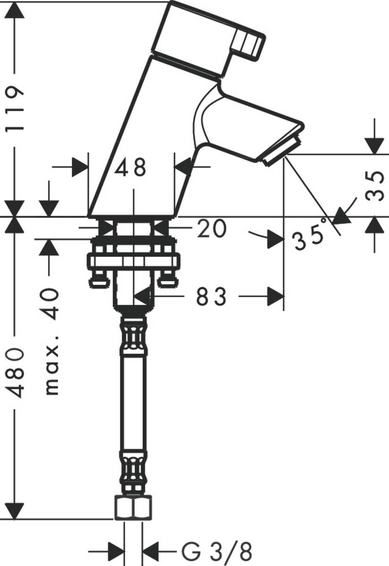 Кран, ½’, ComfortZone 40, выступ 83 мм, тип струи: обычная струя, максимальный расход воды при давлении 3 бара: 5 л/мин, с керамическим вентилем 90°, только для холодной воды, вид соединения: соединительные шланги G ⅜.