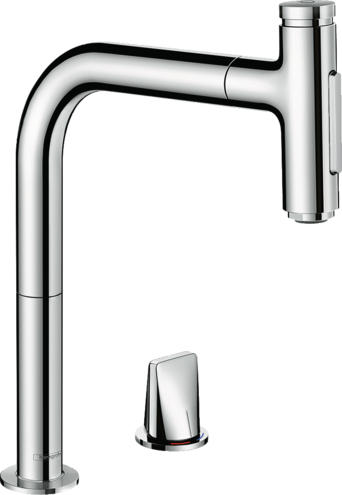 Кухонный смеситель на 2 отверстия, однорычажный, 200, с вытяжным душем, ComfortZone 200, диапазон поворота регулируется в 2 шага до 110 ° или 150 °, гибкое расположение органов управления смесителем, требуется 2 отверстия под смеситель Ø 35 мм, ламинарная струя, струя для душа, блокируемая душевая лейка, струя возвращается через нажимной переключатель спрея, а струя возвращается автоматически при закрытии ручки, кнопка выбора для удобного пуска / остановки потока воды, магнитная опора для душа MagFit, размер подключения: DN15, максимальный расход при давлении 3 бара: 6,8 л / мин, керамический картридж, тип подключения: G ⅜ соединения, встроенный обратный клапан, подходит для проточных водонагревателей. Есть вариант в цвете нержавеющая сталь - арт. 73819800