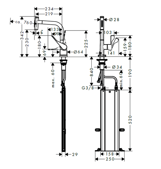 Кухонный смеситель, ComfortZone 230, L-образный излив, угол поворота излива: регулировка на 2 уровня, на 110° или 150°, ламинарная и душевая струя, фиксируемая душевая струя, автоматическое переключение струи в исходный режим закрытием смесителя, кнопка Select: для комфортного включения/выключения воды, магнитная система крепления душа MagFit, керамический узел смешивания, соединительные шланги G ⅜, встроенный клапан обратного тока воды, подходит для проточных водонагревателей, коробка для шланга: короб sBox для тихого, плавного, безопасного перемещения шланга в кухонном шкафу, под столешницей; удлинение шланга - до 76 см.