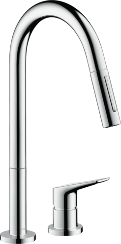 Кухонный смеситель, однорычажный, на 2 отверстия, с вытяжным душем, ComfortZone 220, угол поворота излива: регулировка на 2 уровня, на 110° или 150°, обычная струя, душевая струя, фиксируемая душевая струя, переключение струи в исходное положение нажатием кнопки, магнитная система крепления душа MagFit, душевой шланг Quick-Connect, максимальный расход воды при 3 бар: 9 л/мин, керамический узел смешивания, соединительные шланги G ⅜, регулируемое ограничение температуры, встроенный клапан обратного тока воды, подходит для проточных водонагревателей. Есть варианты в разных цветах с полированной и шлифованной обработкой.