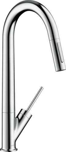Кухонный смеситель, однорычажный, с вытяжным душем, с возможностью размещения рукоятки справа или слева, ComfortZone 270, угол поворота излива: регулировка на 2 уровня, на 110° или 150°, обычная струя, душевая струя, фиксируемая душевая струя, переключение струи в исходное положение нажатием кнопки, магнитная система крепления душа MagFit, душевой шланг Quick-Connect, максимальный расход воды при 3 бар: 9 л/мин, керамический узел смешивания джойстикового типа, соединительные шланги G ⅜, встроенный клапан обратного тока воды, подходит для проточных водонагревателей. Есть варианты в разных цветах с полированной и шлифованной обработкой.