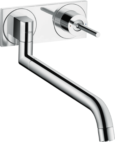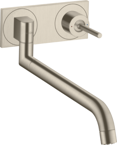 Кухонный смеситель, однорычажный, настенный, с возможностью размещения рукоятки справа или слева, угол поворота излива: регулировка на 2 уровня, на 110° или 150°, с телескопической функцией (330–500 мм), обычная струя, максимальный расход воды при 3 бар: 9 л/мин, керамический узел смешивания джойстикового типа, необходима скрытая часть или основная часть, встроенный клапан обратного тока воды, подходит для проточных водонагревателей. Есть варианты в разных цветах с полированной и шлифованной обработкой.