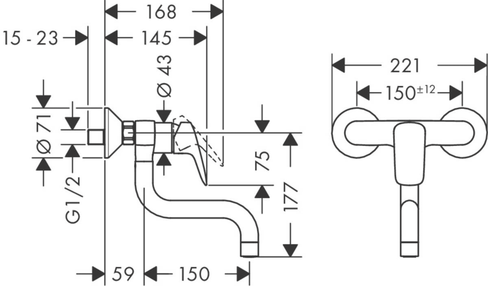 Кухонный смеситель однорычажный, настенный, с низким изливом, угол поворота излива: 220°, обычная струя, межосевое подключение 150 мм ± 12 мм, максимальный расход воды при давлении 3 бара: 13 л/мин, керамический узел смешивания, S-образные эксцентрики, регулируемое ограничение температуры, подходит для проточных водонагревателей.