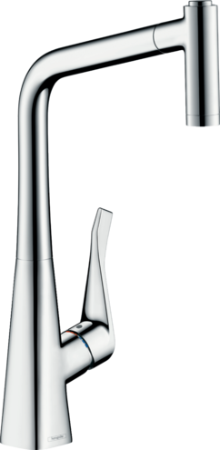 Кухонный смеситель однорычажный, 320, с вытяжным душем, ComfortZone 320, угол поворота излива: регулировка на 2 уровня, на 110° или 150°, ламинарная струя, душевая струя, фиксируемая душевая струя, автоматическое переключение струи в исходный режим закрытием смесителя, магнитная система крепления душа MagFit, душевой шланг Quick-Connect, максимальный расход воды при давлении 3 бара: 10 л/мин, керамический узел смешивания, соединительные шланги G ⅜, регулируемое ограничение температуры, встроенный клапан обратного тока воды, подходит для проточных водонагревателей. Есть вариант в цвете нержавеющая сталь - арт. 14820800