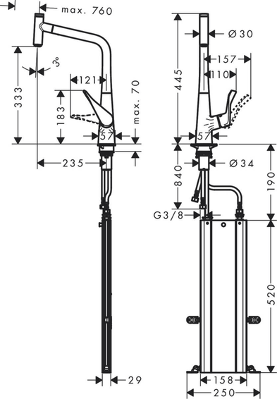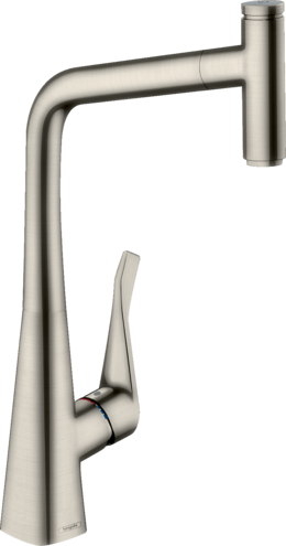 Кухонный смеситель, однорычажный, шланговый ящик, ComfortZone 320, диапазон поворота регулируется в 2 шага до 110 ° или 150 °, ламинарный спрей, кнопка выбора для удобного пуска / остановки потока воды, магнитная опора для душа MagFit, размер подключения: DN15, максимальный расход при давлении 3 бара: 8 л / мин, керамический картридж, тип подключения: G ⅜ соединения, ограничение температуры регулируемое, встроенный обратный клапан подходит для проточных водонагревателей, sBox для бесшумной, плавной и защищенной проводки шлангов в шкафу под столешницей, длина надставки до 76 см, значительное уменьшение разбрызгивания за счет плавного запуска потока воды, Есть вариант в цвете нержавеющая сталь - арт. 73803800